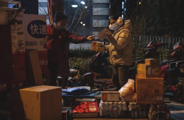 Женщина в маске для защиты от коронавируса смотрит на посылку рядом с курьером в Пекине, Китай, 18 января 2022 года. (AP Photo/Ng Han Guan)