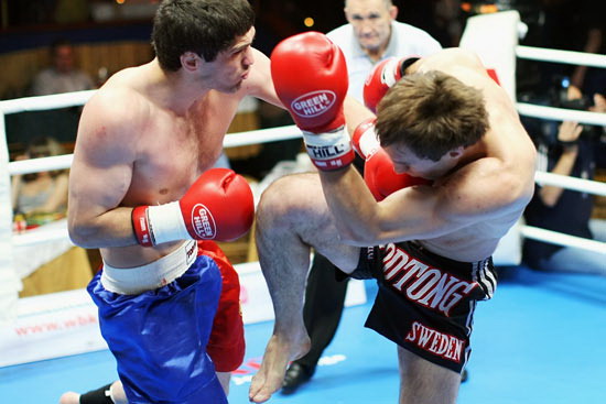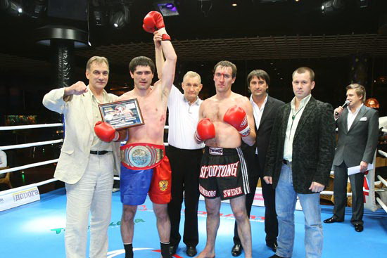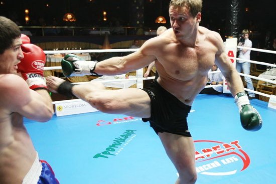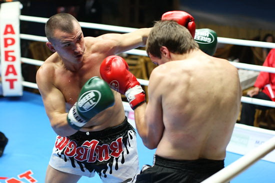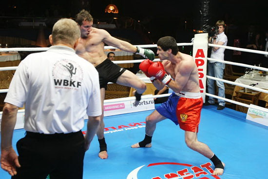 Чемпион мира 2003, 2-кратный чемпиона Европы WBKF, чемпион России (лоу-кик) 2005, чемпион России 2008 по кикбоксингу Гамзат Исалмагомедов, одолевший по очкам (3:0) призера Кубка Мира, чемпиона Европы по кикбокингу, чемпиона России по панкратиону Виталия Шеметова по прозвищу «БАДИ» (Россия, Омск). Фото: Клуб «Арбат»
