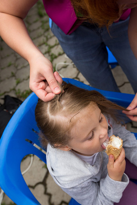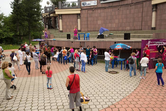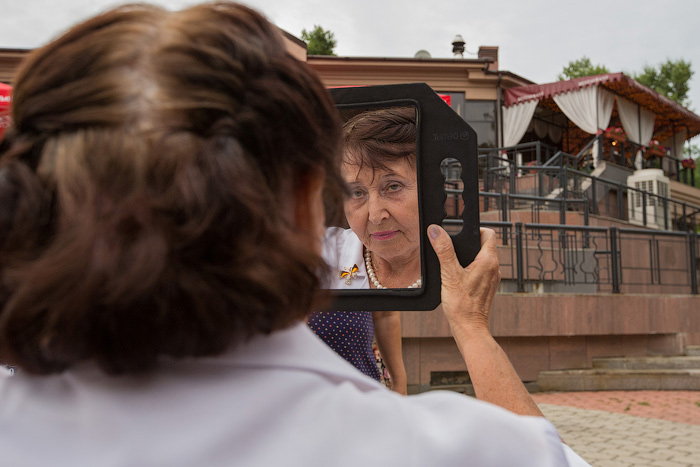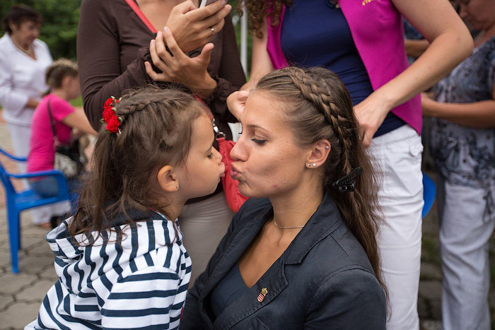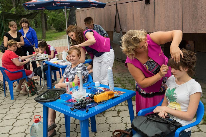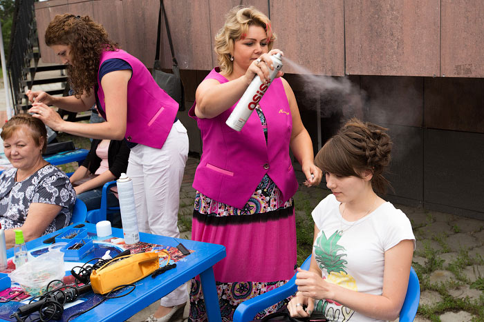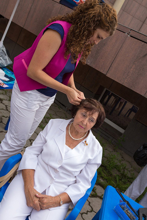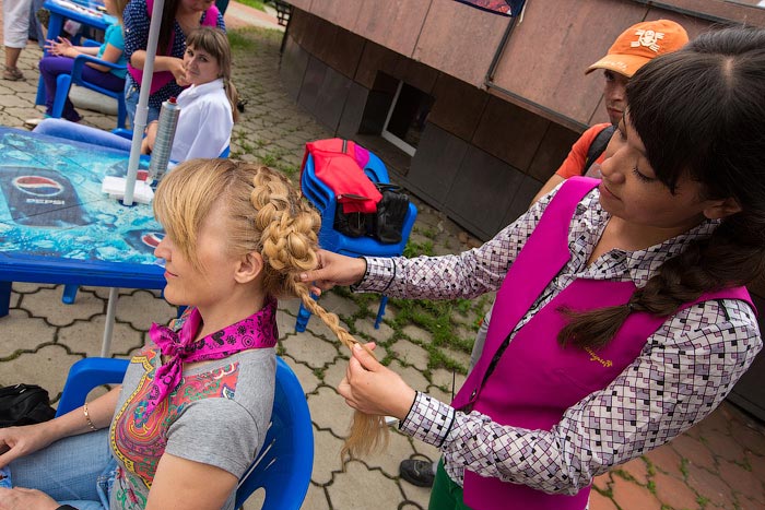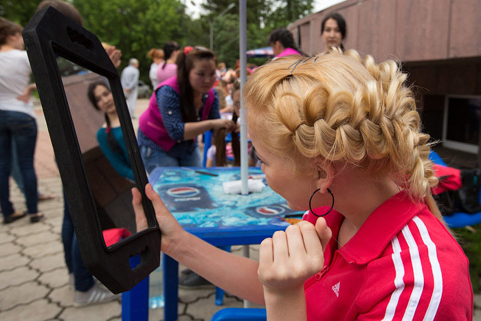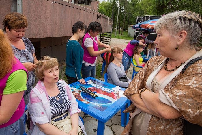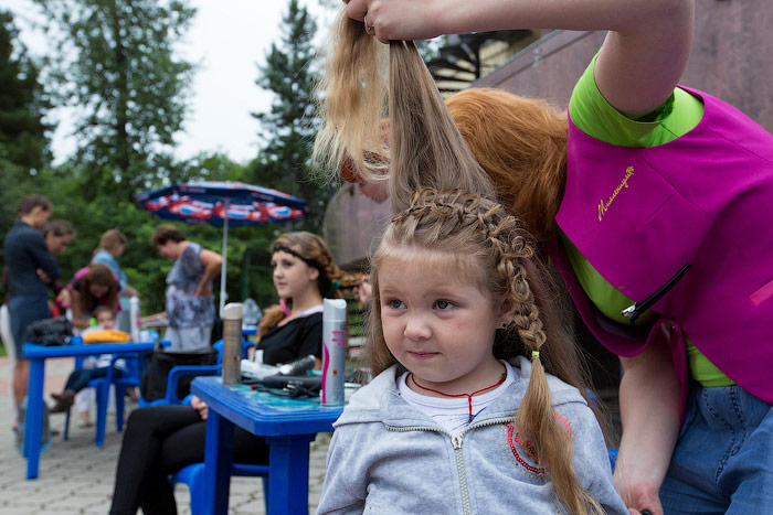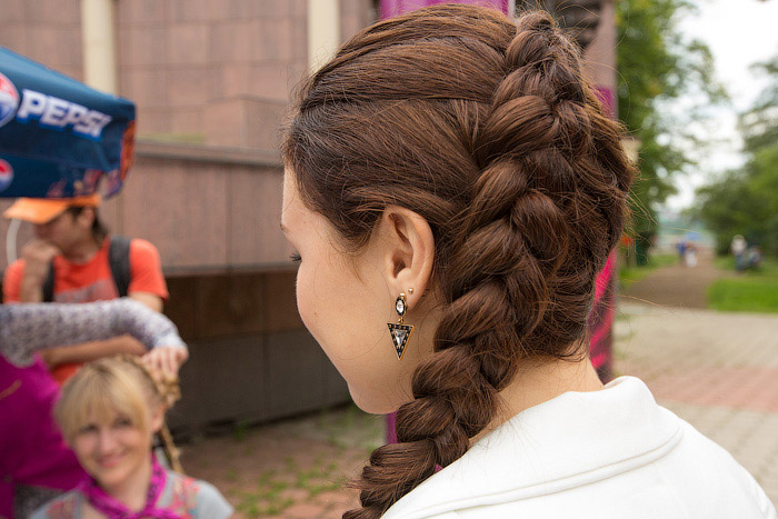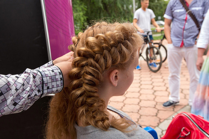 Замечательно, что на таких встречах общаются люди из всех слоёв общества. Несмотря на то, что накрапывал дождик, люди не расходились, а только прибывали. Всё больше было желающих и причёску сделать, и самому поучиться. Весь урок косоплетения горожане могли записать на видео.