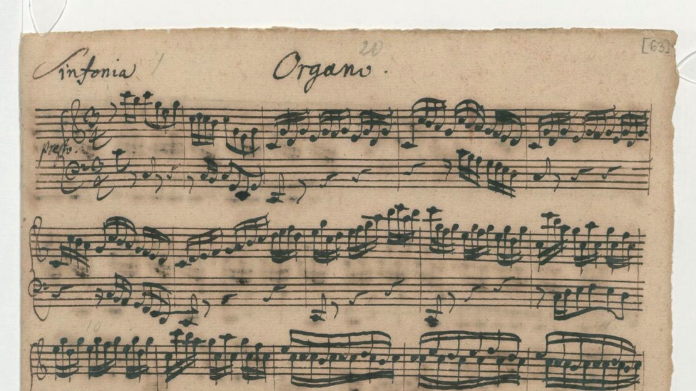 Рукопись Баха с автографом партии органа облигато вступительной симфонии кантаты «Wir danken dir, Gott, wir danken dir» (Благодарим Тебя, Боже, благодарим Тебя) BWV 29 (Каталог произведений Баха), 1731. Цифровой архив Баха, Лейпциг (общественное достояние).