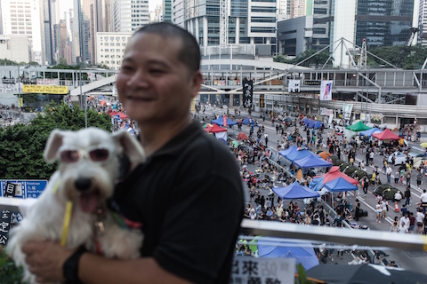 Турист с собакой фотографируется на пешеходном мосту с видом на главное место протестов в Адмиралтейском районе Гонконга 11 октября 2014 года. Фото: Anthony Wallace/AFP/Getty Images