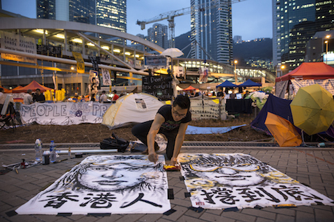 Художник Брайан Чуй рисует протестующую девушку в главном лагере студентов в Адмиралтействе 24 октября 2014 года, Гонконг. Фото: Paula Bronstein/Getty Images