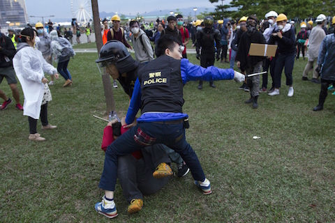Полицейские задерживают протестующих недалеко от здания правительства в Адмиралтейском районе Гонконга, 1 декабря 2014 года. Фото: Dale de la Rey/AFP/Getty Images