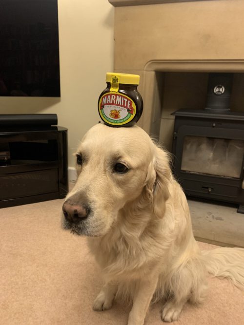 Декстер удерживает на голове мармит. (Любезно предоставлено Caters News)
