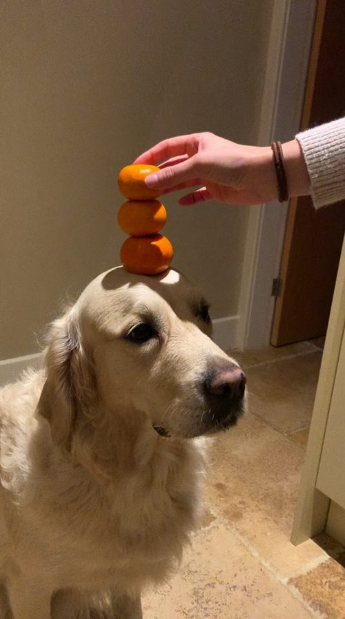«После того, как пёс освоил балансировку, мы стали ставить ему на голову разные предметы и говорить „стой“, а затем снимали балансирующий предмет с его головы и кормили, — сказал Бенджамин. — Он знает, что если не будет стоять на месте, то не получит лакомство».