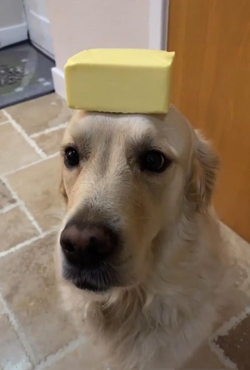 Декстер балансирует с пачкой масла на голове. (Любезно предоставлено Caters News)