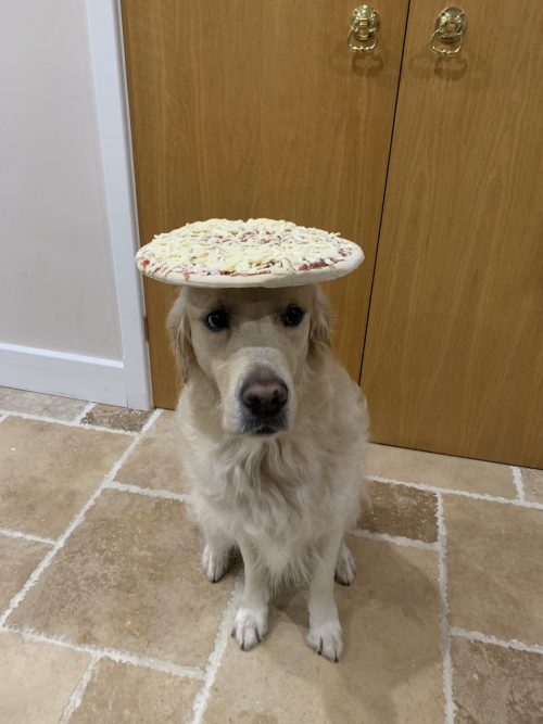 Декстер держит на голове замороженную пиццу. (Любезно предоставлено Caters News)